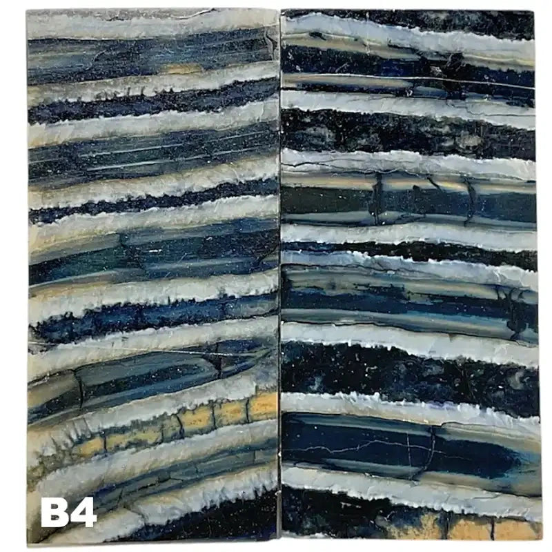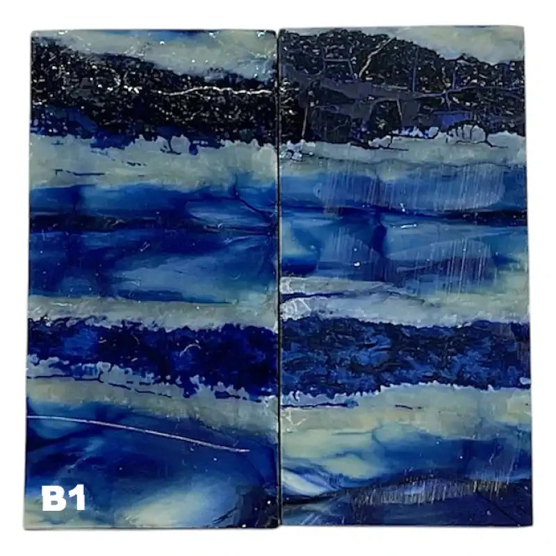 Each of these pieces is cut off of a larger piece of mammoth Molar. The mammoth molar are first stabilized with resin, then cut and then each individual piece is cast in resin again. This produces a more durable material, however, this may also results in resin on the outside of the slabs so each piece may require surface sanding in order to remove the resin from the surface before attaching to a handle.