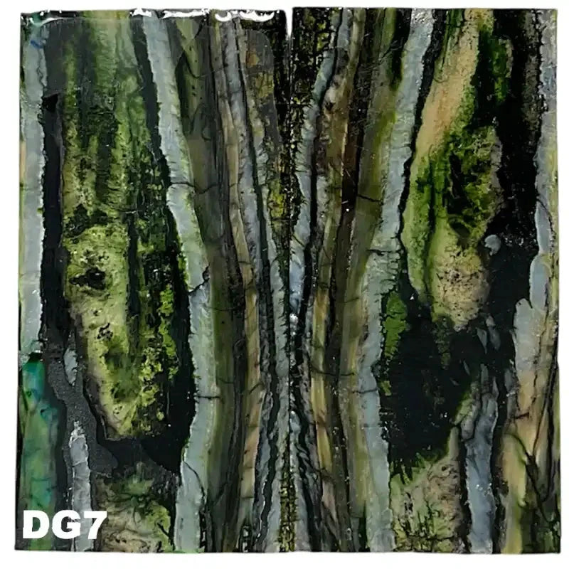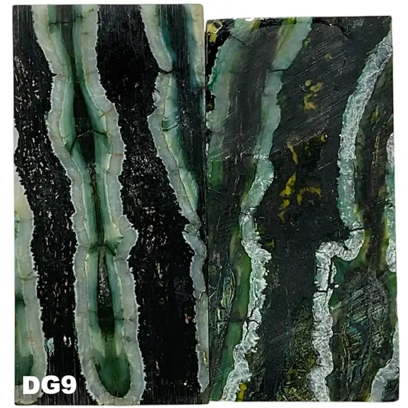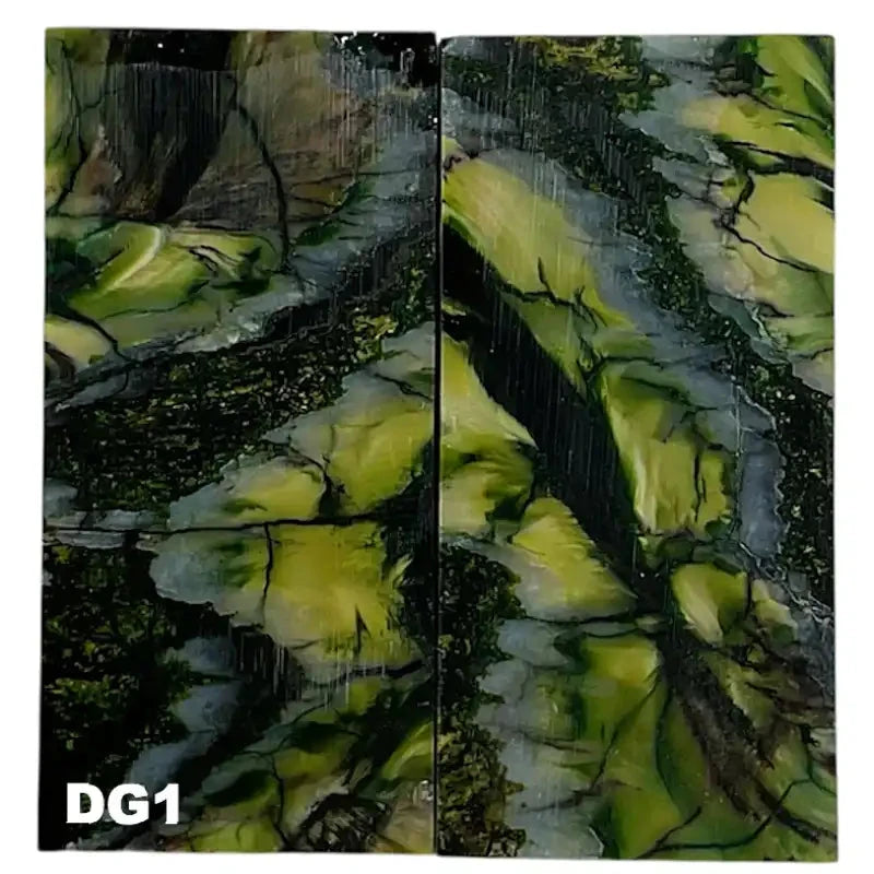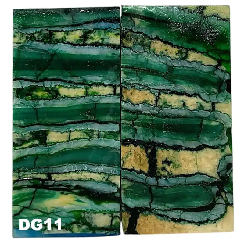 Each of these pieces is cut off of a larger piece of mammoth Molar. The mammoth molar are first stabilized with resin, then cut and then each individual piece is cast in resin again. This produces a more durable material, however, this may also results in resin on the outside of the slabs so each piece may require surface sanding in order to remove the resin from the surface before attaching to a handle.