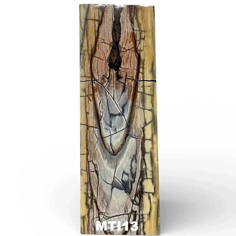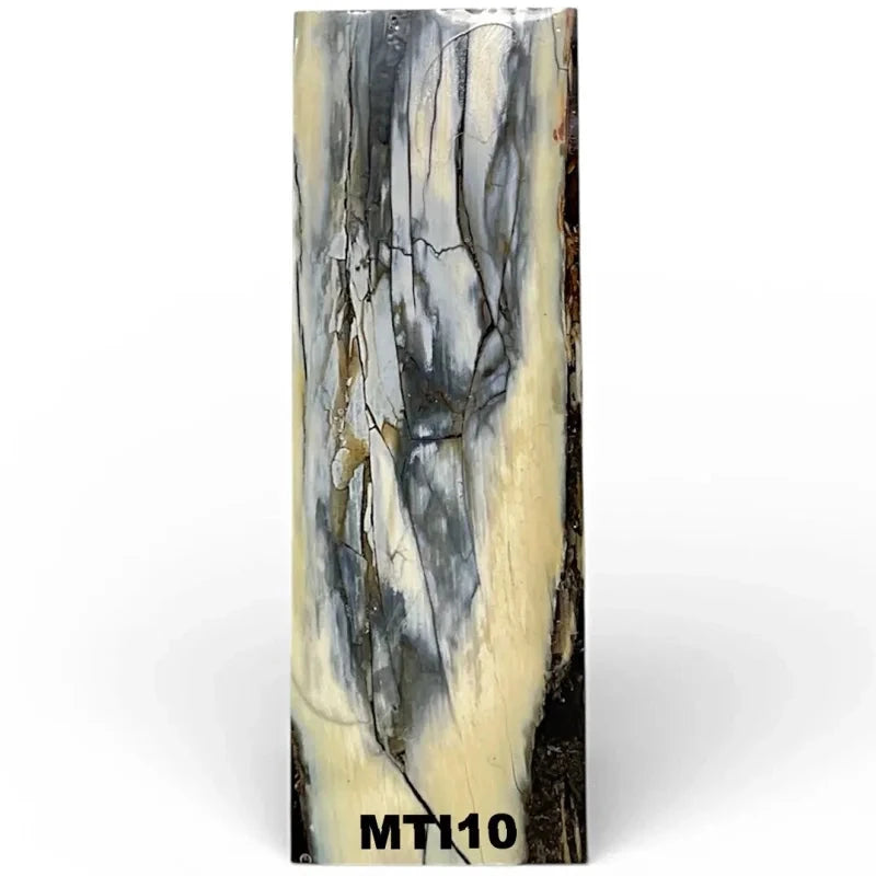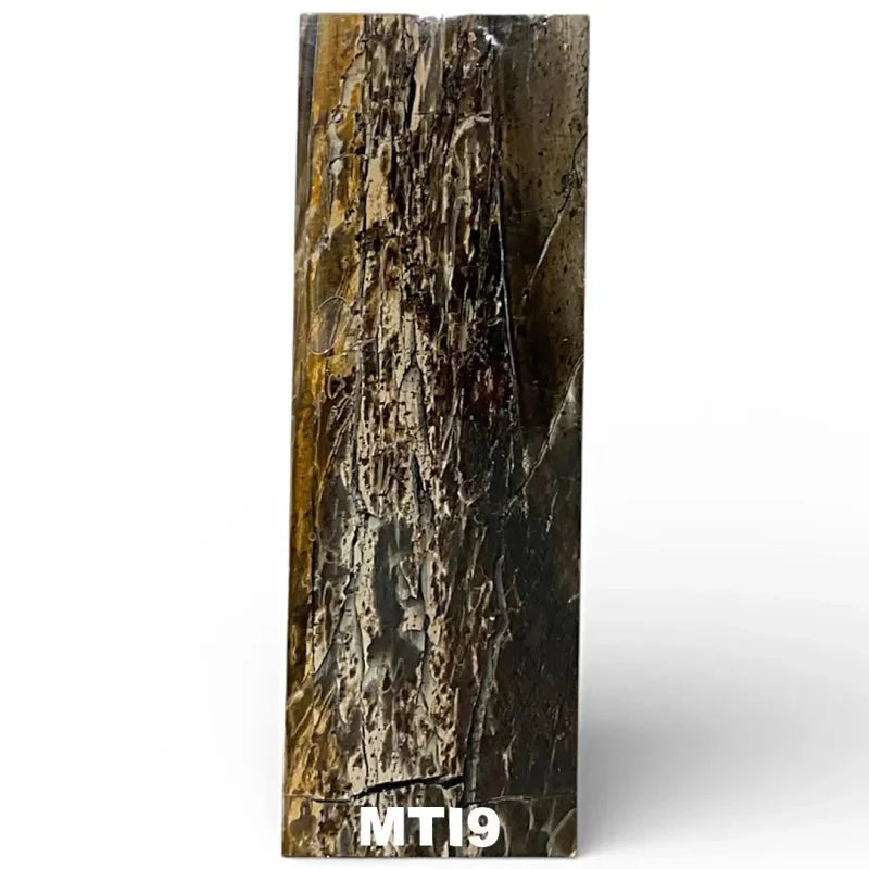 Each of these pieces is cut off of a larger piece of mammoth tusk. The mammoth tusk are first stabilized with resin, then cut and then each individual piece is cast in resin again. This produces a more durable material, however, this also results in resin on the outside of the block so each piece may require surface sanding in order to remove the resin from the surface before attaching to a handle.
