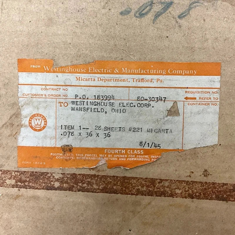 In the early 1940's the Mansfield factory transformed from making household appliances to producing aircraft parts, binoculars and other items for the war efforts. As you can see from the label, these likely left the PA Westinghouse plant in August 1945. Only a month later on September 2, 1945 WWII officially ended. With the end of the war, the Mansfield plant immediately went back to producing appliances, and these sheets, likely intended for use in the aircraft parts they were making for the war, were stashed away and never touched again for decades.