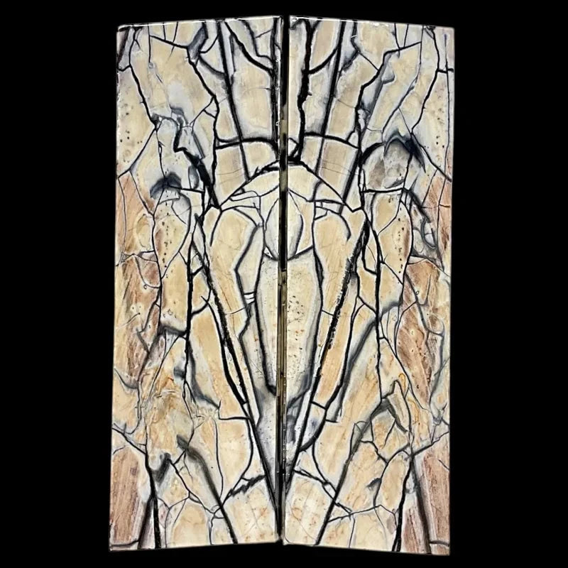 Each of these pieces is cut off of a larger piece of mammoth tusk. The tusks are first stabilized with resin, then cut and then each individual piece is cast in resin again. This produces a more durable material, however, this also results in resin on the outside of the block so each piece may require surface sanding in order to remove the resin from the surface before attaching to a handle.